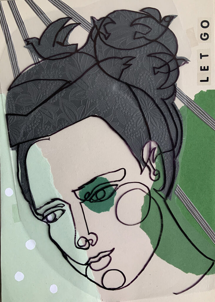 »Let Go«, Mischtechnik, Folienzeichnung und Collage mit Farbpapieren, 2023