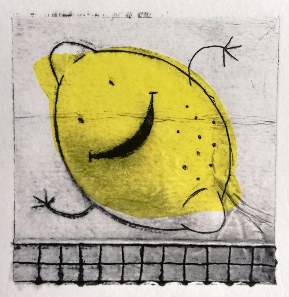 »Make Lemonade«, Mischtechnik,Tetra Pak-Druck kombiniert mit Chine Collé, 2024