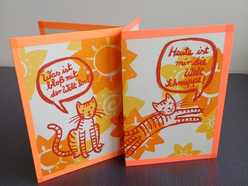 Im Riso-Verfahren gedruckte Klappkarte, »Heute ist mir die Welt Schnuppe!«, 2025